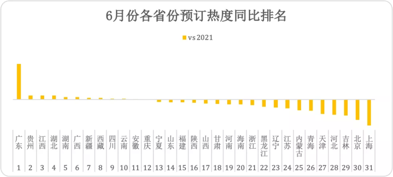 数据来源:丽呈集团酒店数据研究院 进入到7月份,当前预订表现与去年同期的差距较前几个月来看明显缩小,较前年已有超过6成的涨幅。今年7月整体市场预订热度达到去年同期的85%左右。 广东、湖北、云南等多省现已超过去年同期水平。北京、青海、上海是当前相对预订热度排名靠后的省份,较去年降幅在60%左右。 较前年来说,全国大部分省份已超过前年同期水平,新疆省更是达到3倍以上的涨幅。